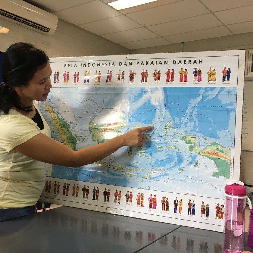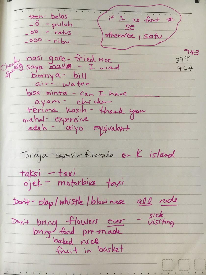 Today is Indonesia’s Independence Day! We are trying to learn the language around us.  At first glance, it is a long succession of letters with no rhyme or reason. However, it is completely phonetic.  The vowels say the same sound 99% of the time.  How marvelous is that!?  It has been fun to start hearing words I recognize in conversations.  We were blessed with a crash-course in Indonesian the first week we were here.  I plan on learning more AND working with the Littles on it. The Bigs will be taking Indonesian as part of school course work.  Michael is going to focus on teaching this year and tackle Indonesian next year (that’s the thought for now, anyway!).  Here are some notes and pics from class!  See what you can pick out!  There is also a song in Indonesian I posted a couple of months ago-the words are on it to follow along!